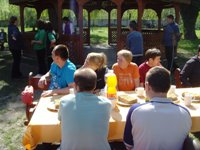 bol u nás slávnostný deň – klienti, ktorí sa narodili v mesiaci apríl, oslavovali svoje narodeniny. Bol krásny, slnečný deň, takže pred oslavou narodenín sme na dvore zariadenia organizovali zábavno-športové hry.